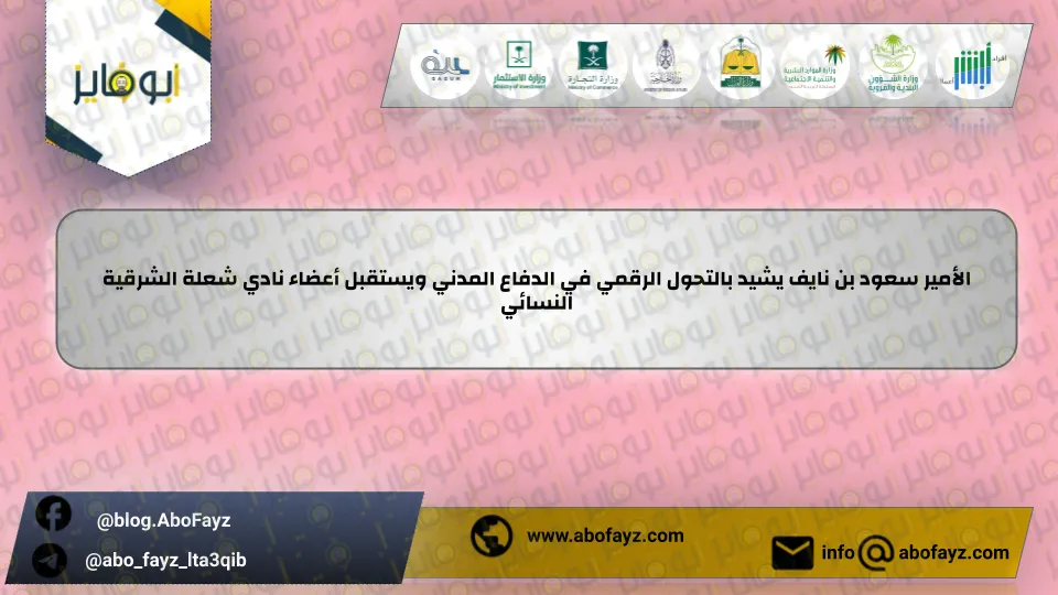 | الأمير سعود بن نايف يشيد بالتحول الرقمي في الدفاع المدني ويستقبل أعضاء نادي شعلة الشرقية النسائي |